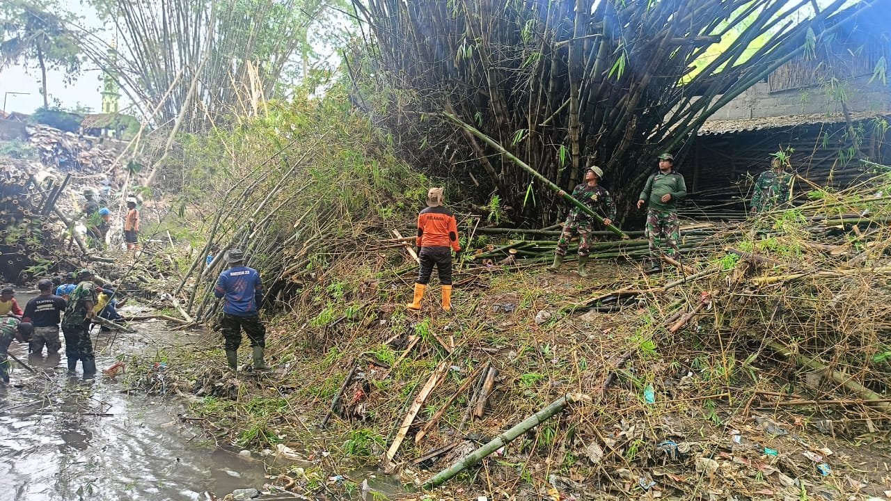 KLATEN – Danramil 19/Trucuk Kodim 0723/Klaten, Kapten Inf Widoyo bersama 9 orang Babinsa, relawan, BPBD, dan warga melaksanakan kegiatan Karya Bakti pembersihan rumpun bambu yang roboh ke aliran Sungai Kali Cino sekaligus pembersihan sungai di Dukuh Buluwangi, Desa Jatipuro Kecamatan Trucuk Kabupaten Klaten, guna mengantisipasi potensi banjir pada musim penghujan. Minggu (18/01/2026)