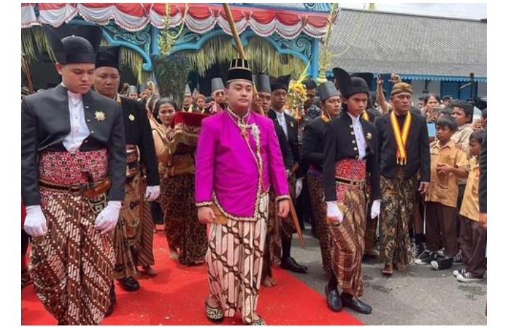 Terlihat sejumlah abdi dalem membawa sejumlah udik-udik, hingga pusaka keraton. PB XIV mengenakan setelan Beskap Raja warna ungu.