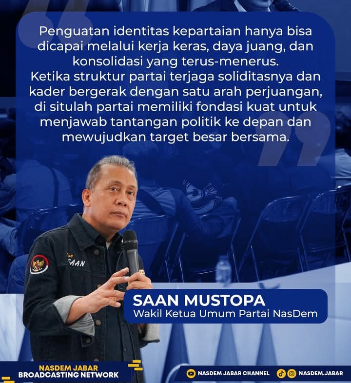 Wakil Ketua Umum Partai NasDem, Saan Mustopa, menegaskan bahwa penguatan identitas kepartaian hanya dapat dibangun melalui kerja keras, daya juang, dan konsolidasi yang dilakukan secara terus-menerus.